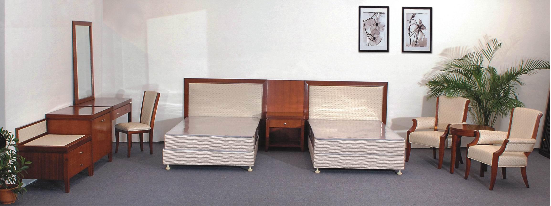 基板材采用25mm中纤板面贴樱桃实木皮,四边封橡木实木边,采用 油漆,透明清漆,PE底漆,PU面漆,荔枝核色,床屏采用50密度海绵,麻布面。