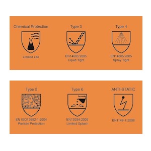 Type 6, EN 13034 Protection against liquid chemicals (spray, aerosol)