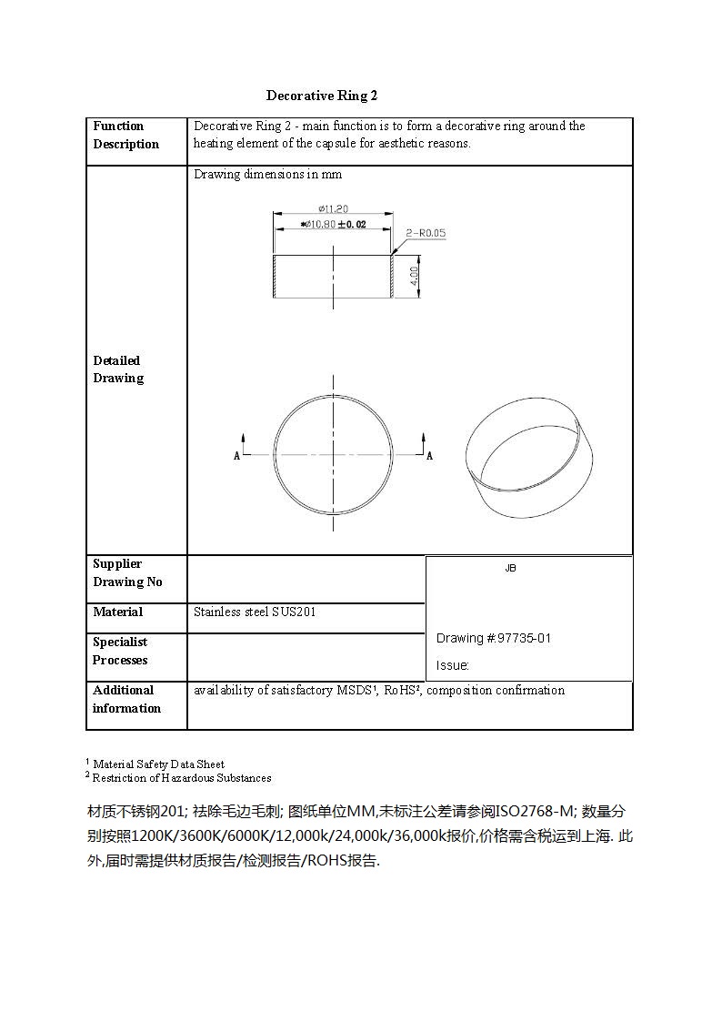 36,000,000个 | SUS201(精密无缝)毛细管套. 外径11.20 x 内径10.80(+/-0.02MM) x 壁厚0.20MM,高度4MM,两端倒角R0.05MM; 表面光面,无刮伤划伤; 产品主要用途是遮盖住散热原件(小盒子里面),起装饰作用; 数量3600万件,产品出口到欧洲. |