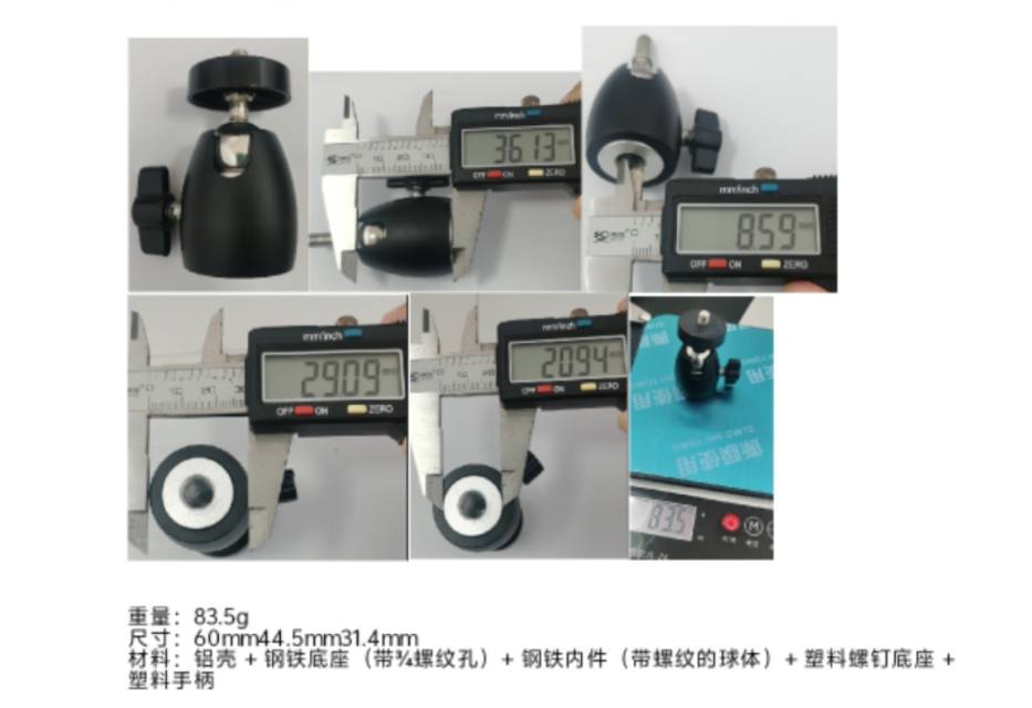 材料:铝壳+钢铁底座(带?螺纹孔)+钢铁内件(带螺纹的球体)+塑料螺钉底座 +塑料手柄