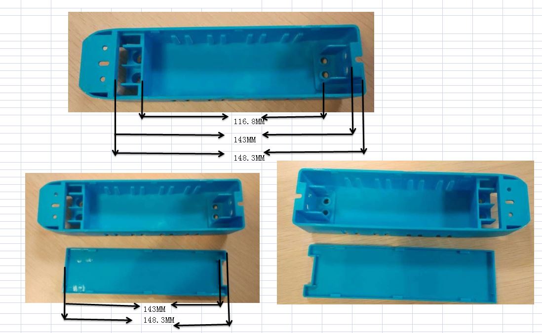 我公司需要塑胶外壳,具体见附件图片: 尺寸:长171*宽46*高30MM (可能会有测试误差) 外壳上盖有点弧形状: 边盖那头的高度为24.6MM 另一头的高度为28.1MM 外壳中间 为30MM,采购量为10000PCS。报价请报含税含运费,收货地址为:广东—佛山—佛山市顺德区,欢迎报价。