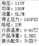 电压:110V 功率:150W 流量:5L/M 停止压力:160PSI 吸程:2米 介质温度:0-60℃ 产品净重:2.5KG 接头配件:≥四个