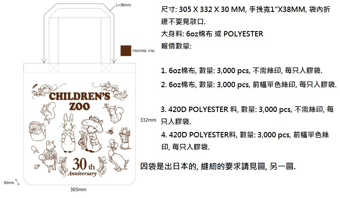 手提袋 6,000 我公司采购纯棉及涤纶手提袋,每款印刷及不带印刷各3000件,尺寸: 30.5*33.2*3CM,详见图片,请报 ,欢迎报价!