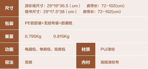 5,000件 | 游乐场:29*19*36.5cm 肩带:72-102cm 材质PU/涤纶 五金:8号铜牙拉链。 |