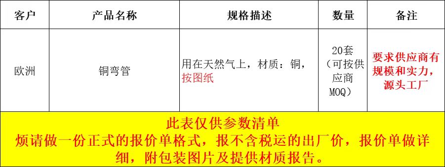 | 补充说明 | 有铜弯管(用在天然气上)的采购需求,这款产品出口客户,详情见图纸。要求:报EXW不含税运的 或USD美金价格,寻找专业做烟机灶具或燃气配件的生产厂家, 符合要求并感兴趣有实力的供应商请+V:1327101427(非手机号,10位数),中间商勿扰。 |